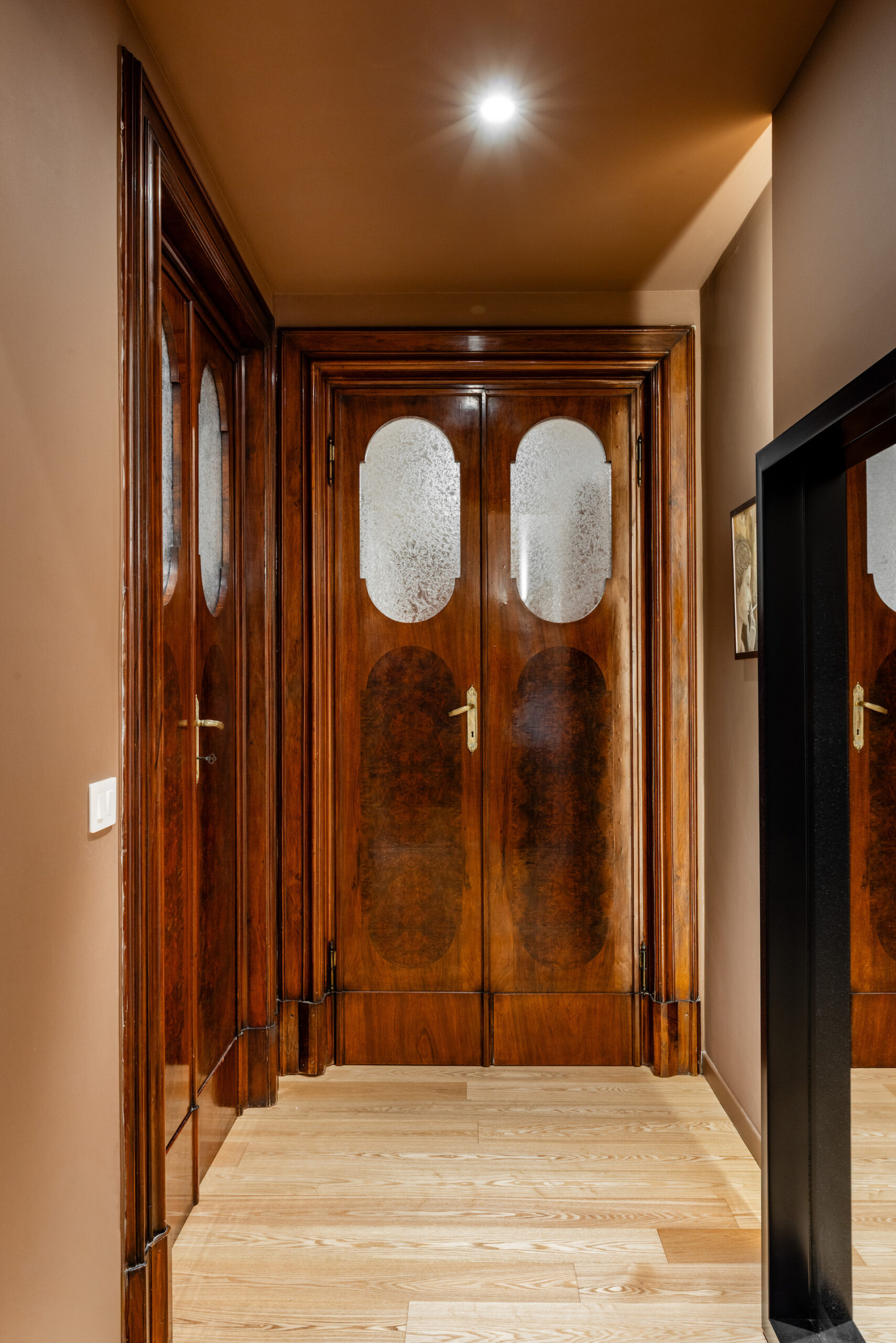 L’appartamento di 150 MQ è composto da una camera da letto padronale con bagno en suite e cabina armadio, una camera degli ospiti ed uno studio, un bagno, un’ampia zona giorno e una cucina abitabile. La distribuzione interna è rimasta grosso modo inalterata e tutti gli ambienti interni condividono il lungo corridoio d’ingresso dell’impianto originale.